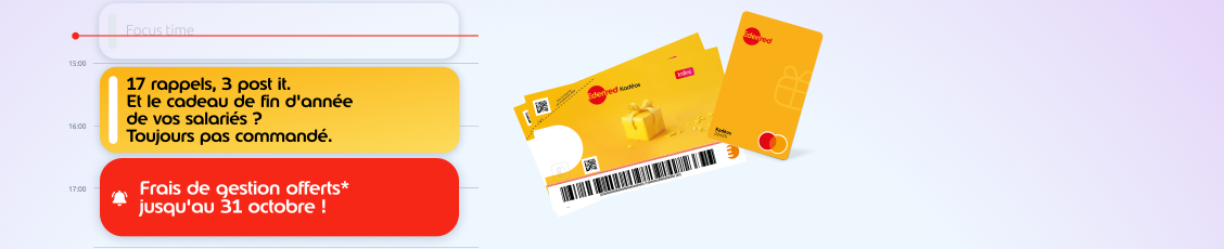 (*)Frais de gestion offerts pour toute commande de chèques Kadéos, cartes Kadéos ou Kadéos Connect validée entre le 01/10/2025 et le 31/10/2025 en France métropolitaine, d’un montant minimum de 450€ et maximum de 10 000€.