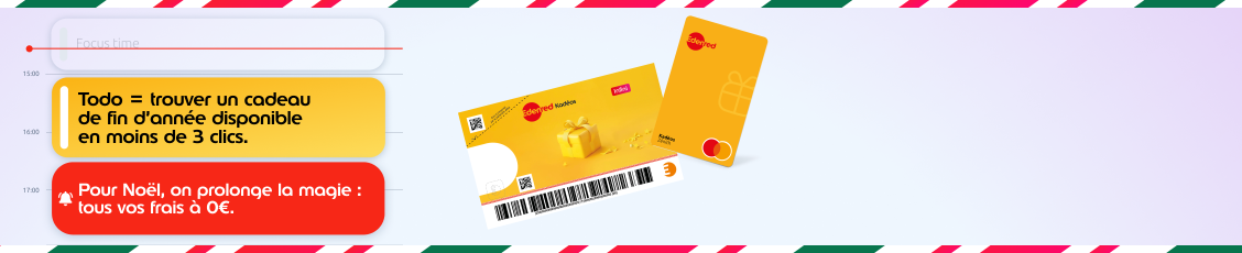 *Tous les frais offerts pour toute commande de chèques Kadéos, cartes Kadéos ou Kadéos Connect validée entre le 01/12/2025 et le 31/12/2025 en France métropolitaine, d’un montant minimum de 450€ et maximum de 10 000€. Offre réservée aux entreprises privées de 1 à 49 salariés en France Métropolitaine. Offre applicable une seule fois au cours de la période et non cumulable avec une autre offre promotionnelle en cours et hors accords-cadres en cours.